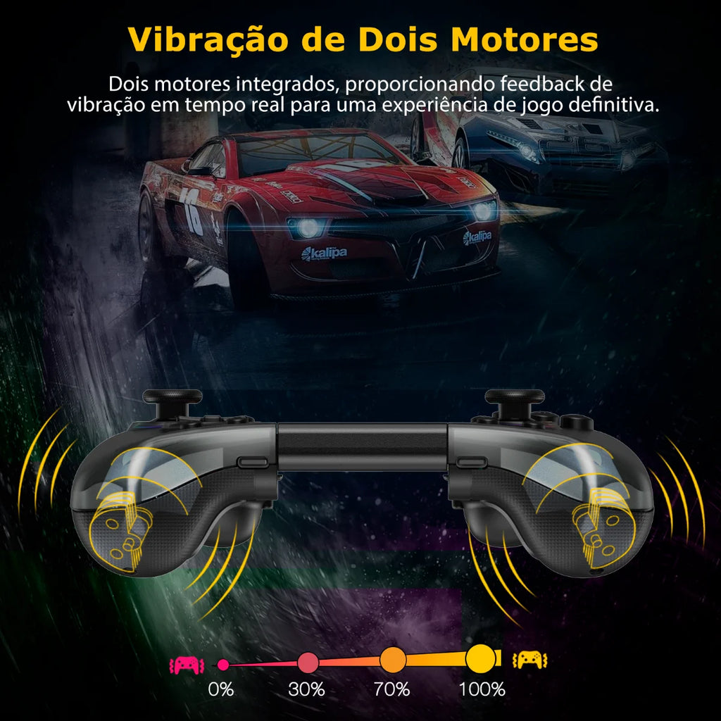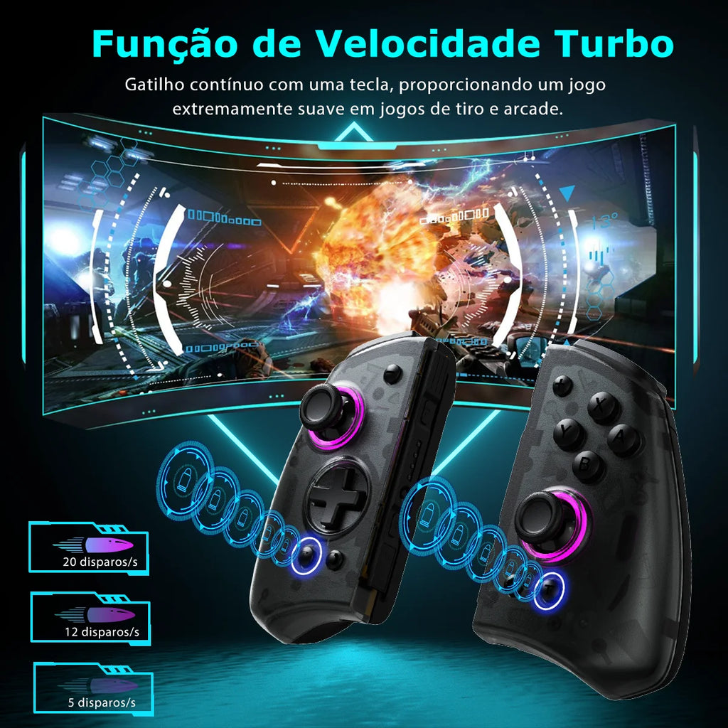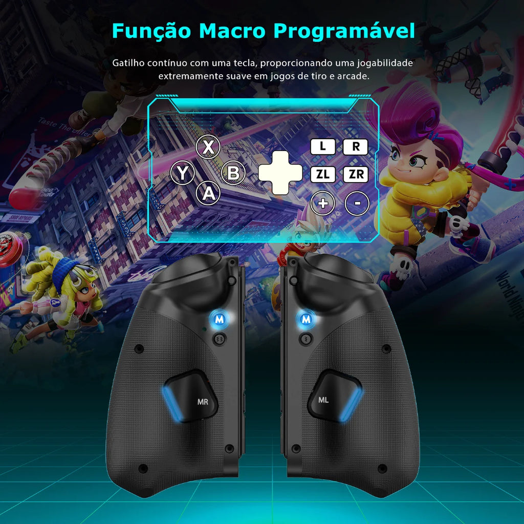 Compatível com Nintendo Switch, Switch Lite, Switch OLED, PC e dispositivos móveis, possui conexão Bluetooth e design ergonômico para sessões prolongadas de gameplay.